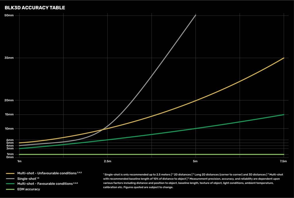 - For critical measurements, dedicate a separate multi-shot. The best accuracy is obtained by keeping the measurement in the center 50% of the imager field-of-view and orienting yourself perpendicular to the object of interest. For the highest accuracy, the integrated laser electronic distance meter (EDM) of the BLK3D will typically measure within +/- 1mm. A laser EDM measurement can be attached to an in-picture measurement in the field using the Tools menu on the BLK3D.