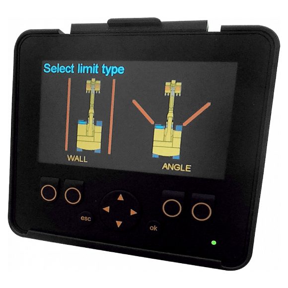 Angular slew is referenced from the centre point of the machine to give a “V” shaped basic left and right control in front of the operator allowing operation for working within the set limits.