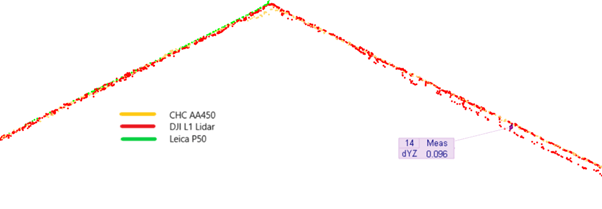 Leica Cyclone 3DR was used to take slices through the data on various surface types in order to assess the relative accuracy (or noise level) of the AlphaAir 450 point cloud.